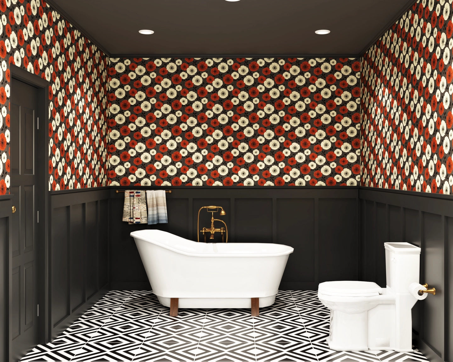 Perfect for a couple, this bathroom design includes a dedicated his and her basin and mirror. The floral wallpaper chosen for this bathroom goes well with the dark theme it has. The flooring has a pattern in a classic black and white combination. To tie the space together, the under...