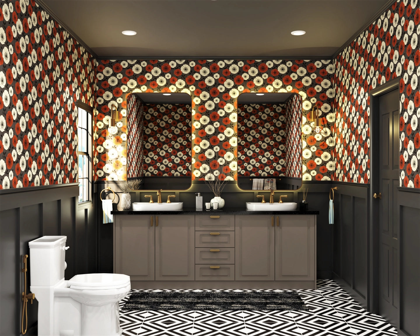 Perfect for a couple, this bathroom design includes a dedicated his and her basin and mirror. The floral wallpaper chosen for this bathroom goes well with the dark theme it has. The flooring has a pattern in a classic black and white combination. To tie the space together, the under sink storage cabinet has a subtle shade of brown. This bathroom has a warm glow provided by the ceiling lights and backlit mirrors. The faucets are golden in shade and match the white tabletop sink and toilet.