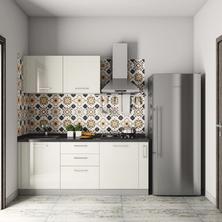 The patterned backsplash adds character to this otherwise simple, muted kitchen. The white cabinets have a suede laminate finish, making them easy to clean and maintain. The granite countertop is highly durable and does not chip easily. In addition to being installed with low-maintenance components, the layout of this kitchen allows for optimal usage of space and is therefore perfect for rented spaces.