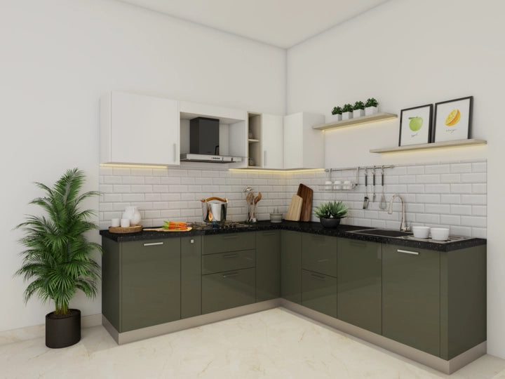 With an open-plan in an autumn leaf colour and the unique contrast of brick pattern to the mix, this L-shaped kitchen is as charming as it is simple. Packed with a punch of various storage units, the kitchen emphasizes utility and ergonomics. The design comes with decorative space on the wall unit for appliances and accessories.