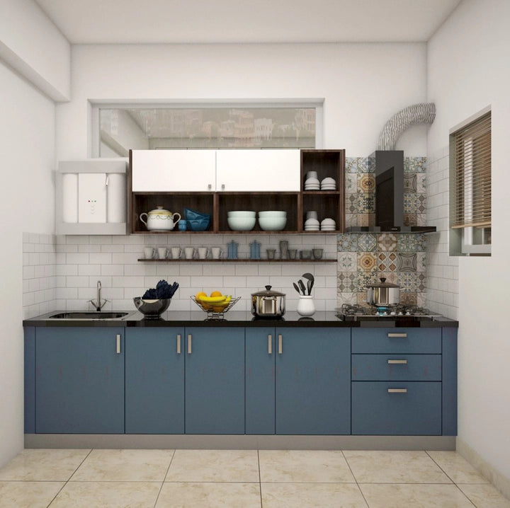 This ergonomic kitchen has a patterned backsplash behind the hob area which provides immediate respite against food stains during the cooking process. The black-coloured anti-scratch countertop is made of granite and the laminate-finished dual-toned shutters of this vibrant kitchen are both anti-scratch and durable. In addition to being low maintenance, the alternating placement of the open and closed shelving elevates the design while providing maximum storage.