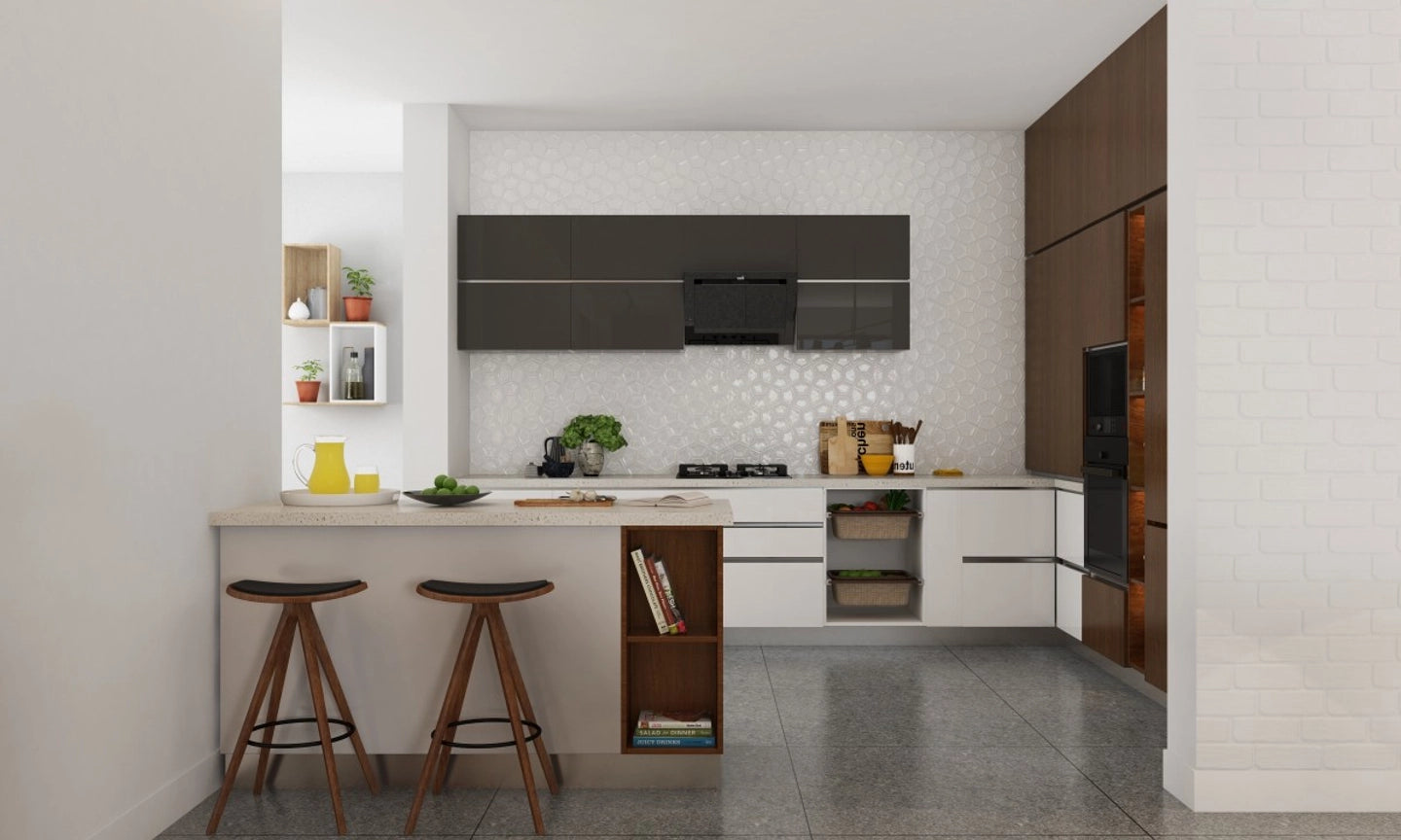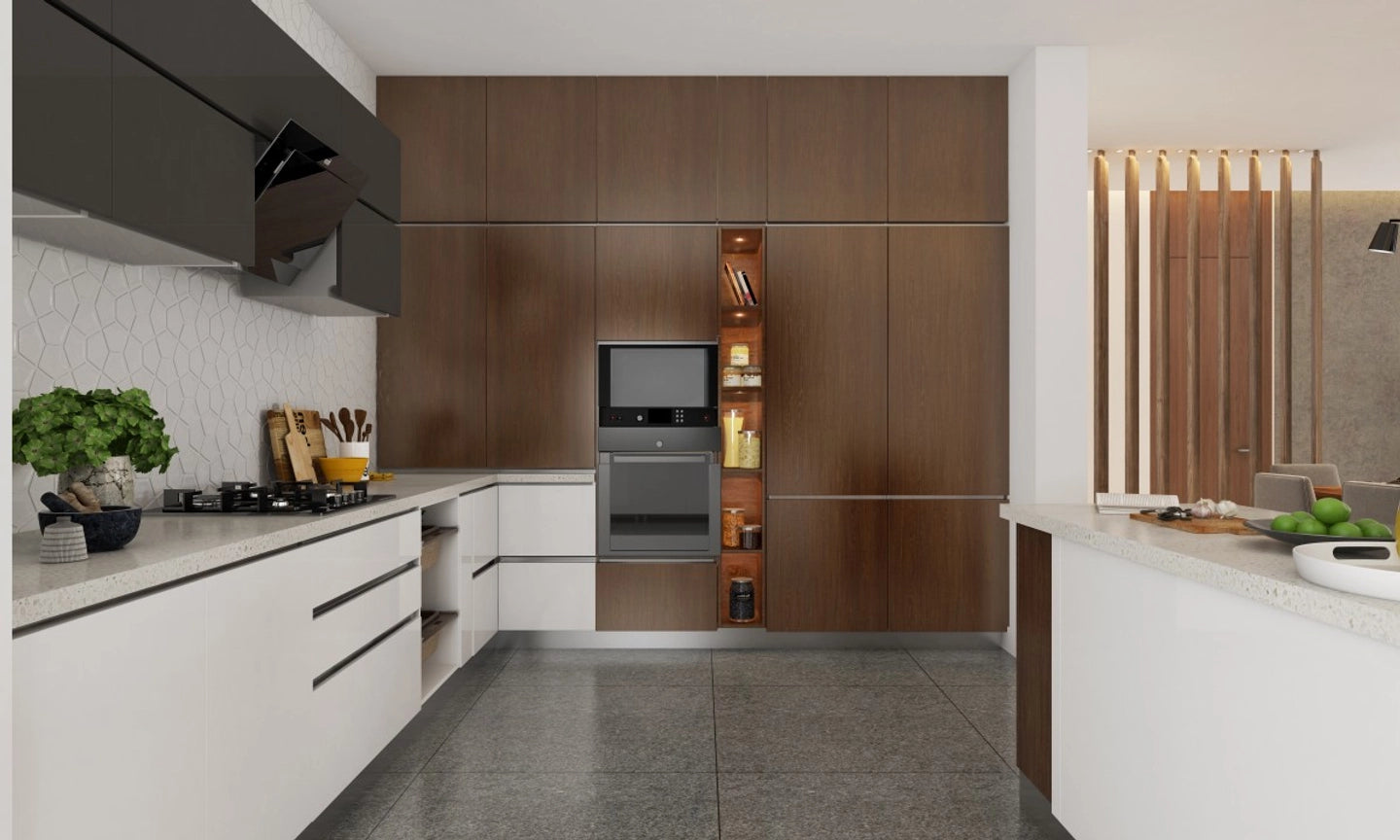 The handsome wood finish of the tall kitchen units plays up the dramatic contrast in this all-white open kitchen. To ensure a seamless flow, two parallel counters provide ample working space, with one pulling double duty as a very trendy breakfast bar. The overhead charcoal grey modular units match the granite grey tiles ensuring a cohesive kitchen both aesthetically and functionally. Built-in oven installed with the tall kitchen units for a seamless finish Shorter kitchen counter doubles up as a breakfast table