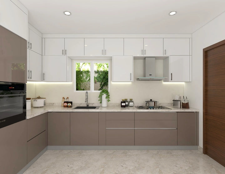 The soft tones of this L-shaped modular kitchen lend it a calming aesthetic. The milky coffee colour of the cabinets ties in perfectly with the creamy tone of the countertop. The quartz countertop is advantageous due to its ability to resist chemical abrasions and the anti-scratch acrylic finish of the...