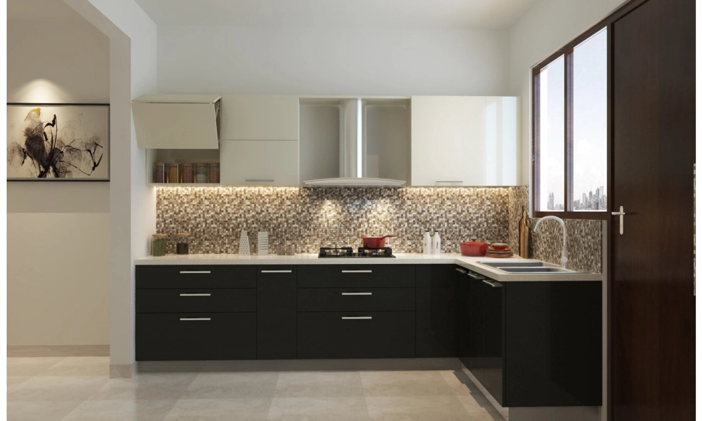 Meticulously planned, this well illuminated kitchen features the perfect assimilation of cooking, cleaning, storage, and refrigeration areas. A mosaic backsplash adds to the graphic appeal of this monochrome kitchen. Features an easy to clean countertop and backsplash to protect your walls Features shelves with frosted grass shutters for easy...