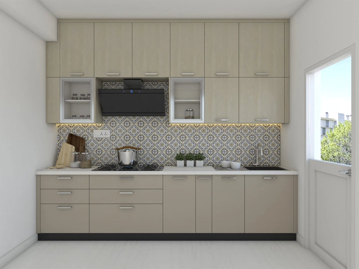 The neutral cream colour of this galley kitchen lends it a premium look. Its glass shutters offer a peek into the pantry. The quartz countertop being stain and scratch-resistant renders the kitchen low-maintenance. The patterned backsplash further provides a protective layer against splatters.