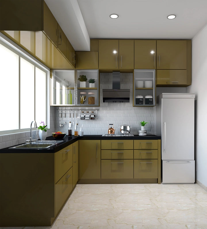 This compact yet efficient contemporary kitchen can store a refrigerator and other kitchenwares. The shiny mud-coloured shutters lend a timeless look to this modular kitchen and the black-coloured countertop also matches seamlessly with the colour palette.