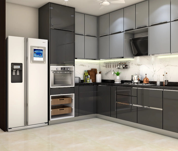 The colour scheme of this kitchen lends it an urban and trendy look, making it perfect for people belonging to younger age groups. The high gloss laminate finish on the shutters give them a unique sheen and adds to the aesthetic of the kitchen. The black granite countertop is forgiving...