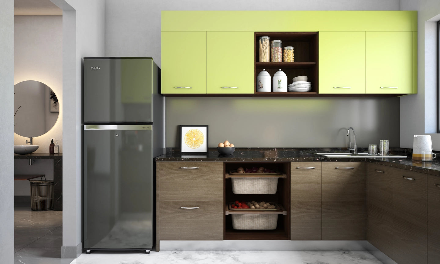 The contrasting colour palette of this modular kitchen makes for a vibrant interior. The wall and base units provide ample storage options and the base units also come equipped with slots for wicker baskets where fruits and vegetables can be neatly stored away.