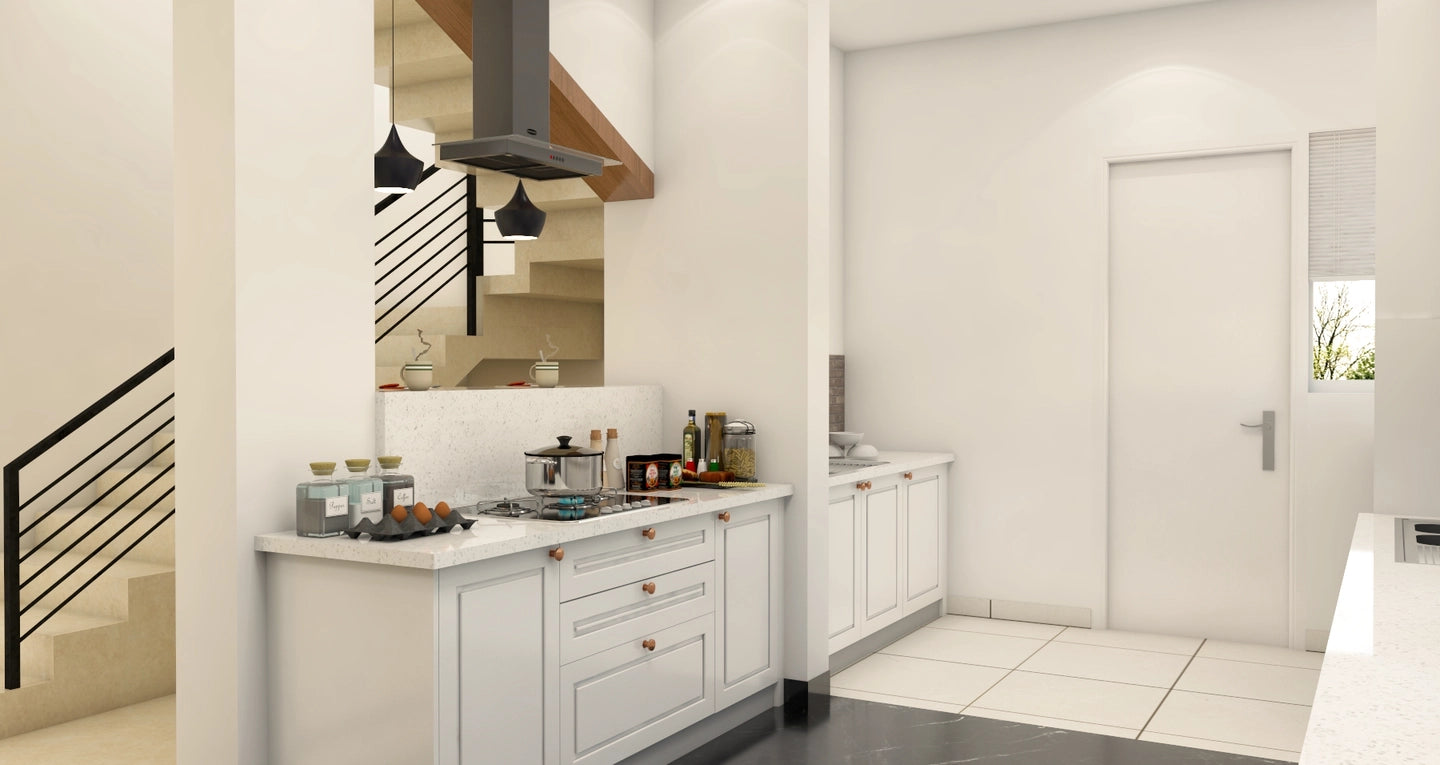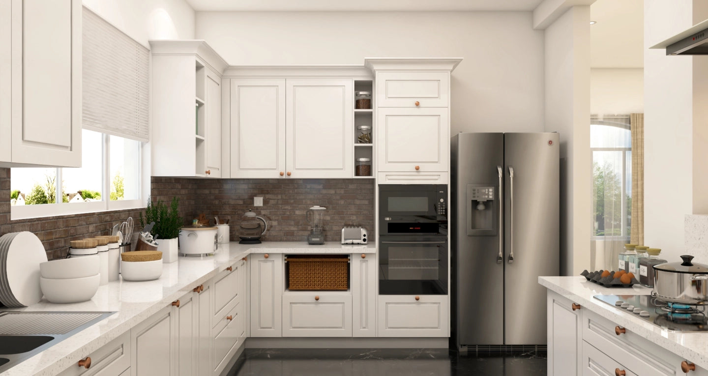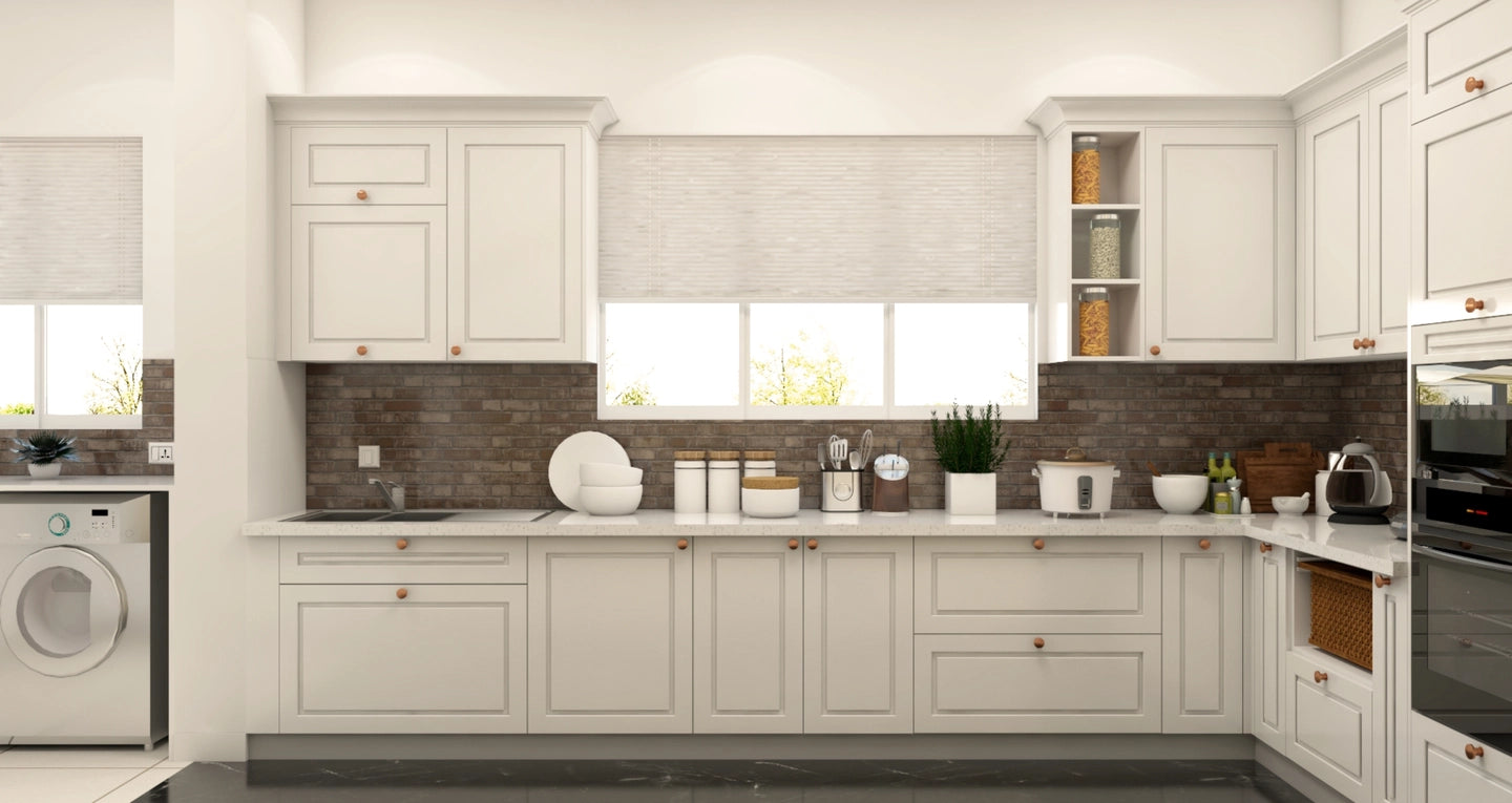 The off-white tone of the shutters together with the contrasting round knobs, lend a quirky look to this otherwise traditional kitchen. The membrane finish of the cabinets adds to the beauty of this kitchen by giving it a natural vibe. The storage capacity even allows room for a washing machine. The highlight of this kitchen is a brick backsplash which goes perfectly well with the quartz countertop that is stain resistant and easy to maintain.