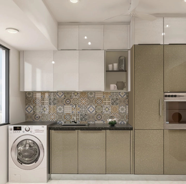 The metallic beige and metallic white colour of this kitchen give it a shiny and calm look. The patterned backsplash works as the centre of attraction and complements the dual-tone of the kitchen well. The addition of integrated chimney, cane wicker basket, and refrigerator unit makes it a maximum convenience...