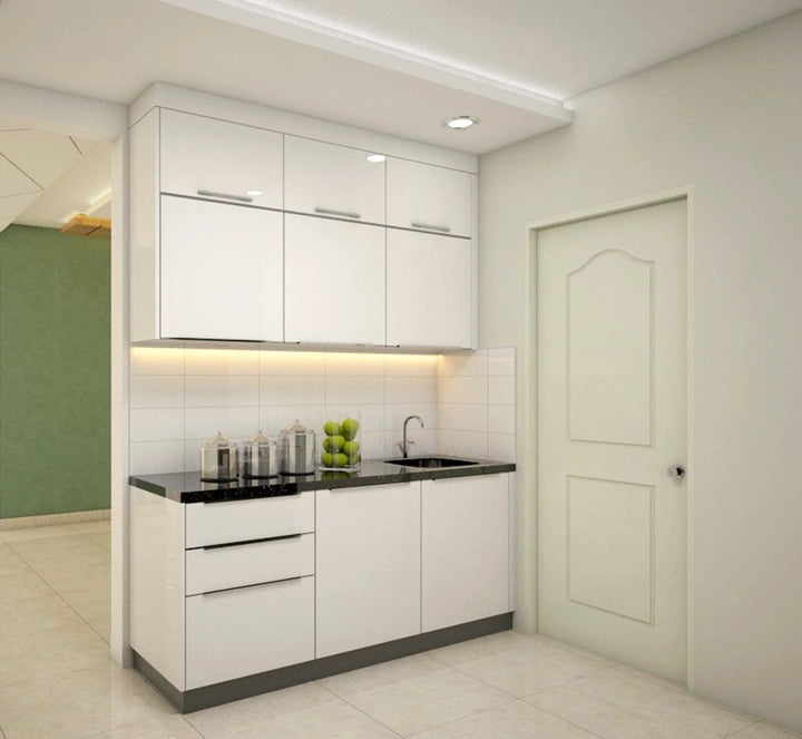 This white kitchen has a timeless and elegant look which will never go out of style. The gloss laminate finish cabinets have the ability to bounce more light imparting a bright and airy look to the space. The recessed lighting, slimline handles and contrasting countertop all infuse warmth, breaking the monotony and lending a luxurious look to this all-white kitchen.