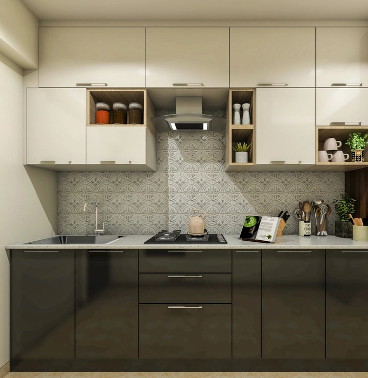 The slate-coloured base cabinets along with the frosty white wall cabinets render the perfect colour combination to this parallel kitchen. The cabinets have a glossy laminate finish which is scratch and stain-resistant. The white-coloured quartz countertop fits perfectly with the textured backsplash, both of which are easy to clean and...