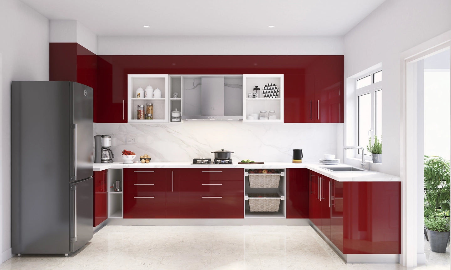 This kitchen is spacious and has a beautiful colour combination. The laminate-finished and vivid red-coloured cabinet shutters lend a reflective look to this kitchen. The colour palette of this sparkling kitchen is further enhanced by the presence of a white-coloured backsplash and countertop made of quartz. The use of bright...