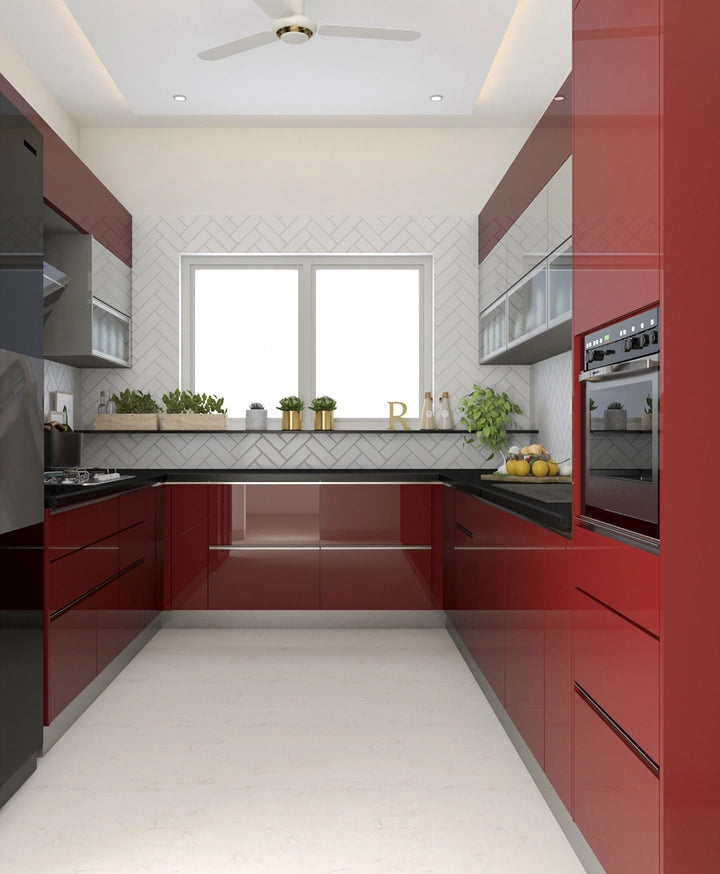The brick red and silver of this kitchen’s cabinets offer it a streamlined and posh look. The brick patterned backsplash is perfect as it does not take attention away from the colour scheme and aesthetic of the kitchen. The cabinetry not only provides adequate storage but also adds to the sleekness of the design, retaining its clean and timeless elegance for years to come.
