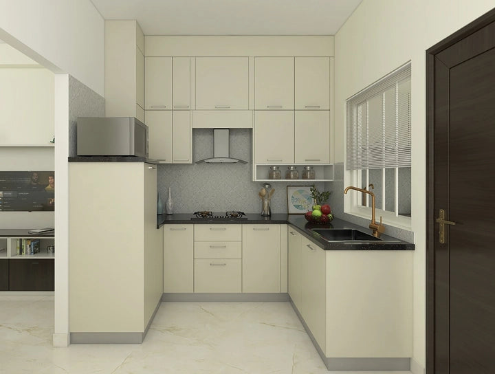 This U-shaped kitchen offers a lot of cooking space adding to the ergonomic design quotient. Being white, it also reflects whatever natural light is present in the room, thus making the space appear even bigger. It not only has wall, base and loft cabinets for maximum storage, but also comes equipped with a built-in chimney, hob and microwave that adds to the convenience factor.