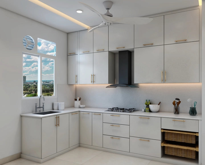 This kitchen's muted tones make it perfect for people belonging to all age groups. The white quartz countertops are matched perfectly with the frosty white colour of the cabinets and give the kitchen a more organised look. The quartz surface allows for easy cleaning. The L-shaped kitchen design makes it possible to accommodate more than one cook. The suede laminate finish makes maintenance more convenient.