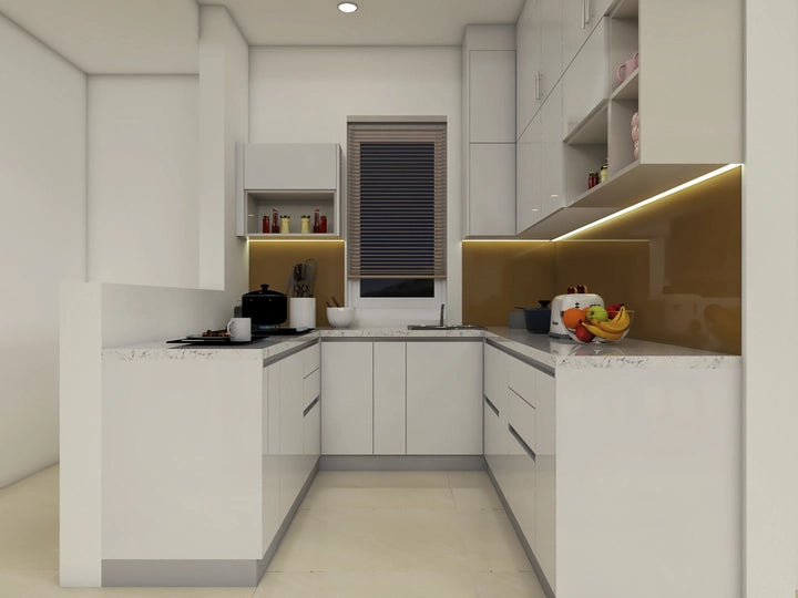 This kitchen is built with durable materials and provides maximum convenience. It has several open and closed shelving for storage purposes. The cabinet shutters can withstand wear and tear due to the presence of high gloss laminate finish and the countertop made of quartz is durable, environment-friendly and anti-bacterial, further adding to the low maintenance factor of this kitchen.