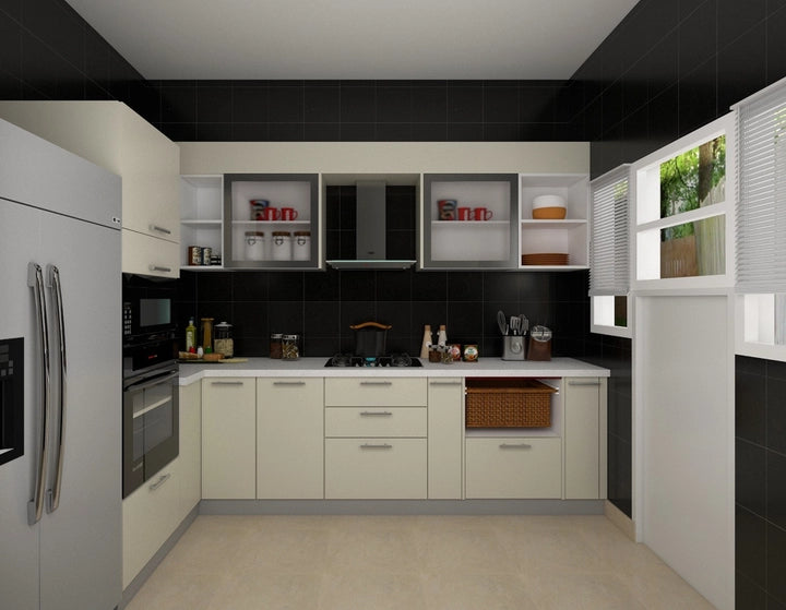 The frosty white and jet black colour combination of this kitchen lends it a chic, ultramodern look. The cabinets not only provide high storage but have a laminate finish which makes cleaning a breeze. The quartz countertop is highly durable and heat-resistant. These properties make this perfect as a rental...