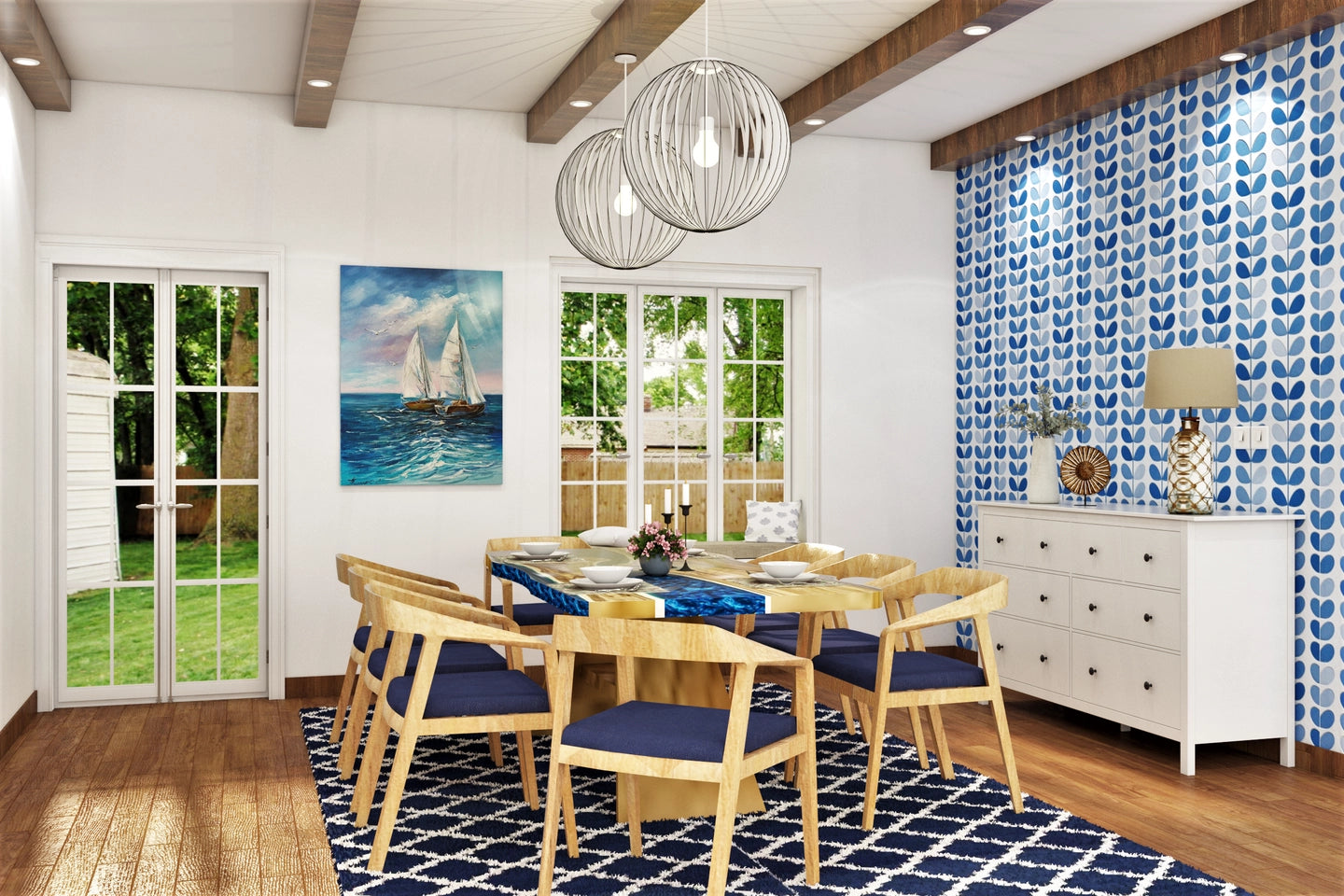 A blue and white combination is noticed in this dining space. Hints of light wood make the space complete. This dining room design has a windy feel with a sailboat artwork on the wall, large window and door, and two big lamps that hang from the recessed ceiling. This design is suitable for large homes with a backyard attached. To add to the convenience, a sideboard is added to the space.