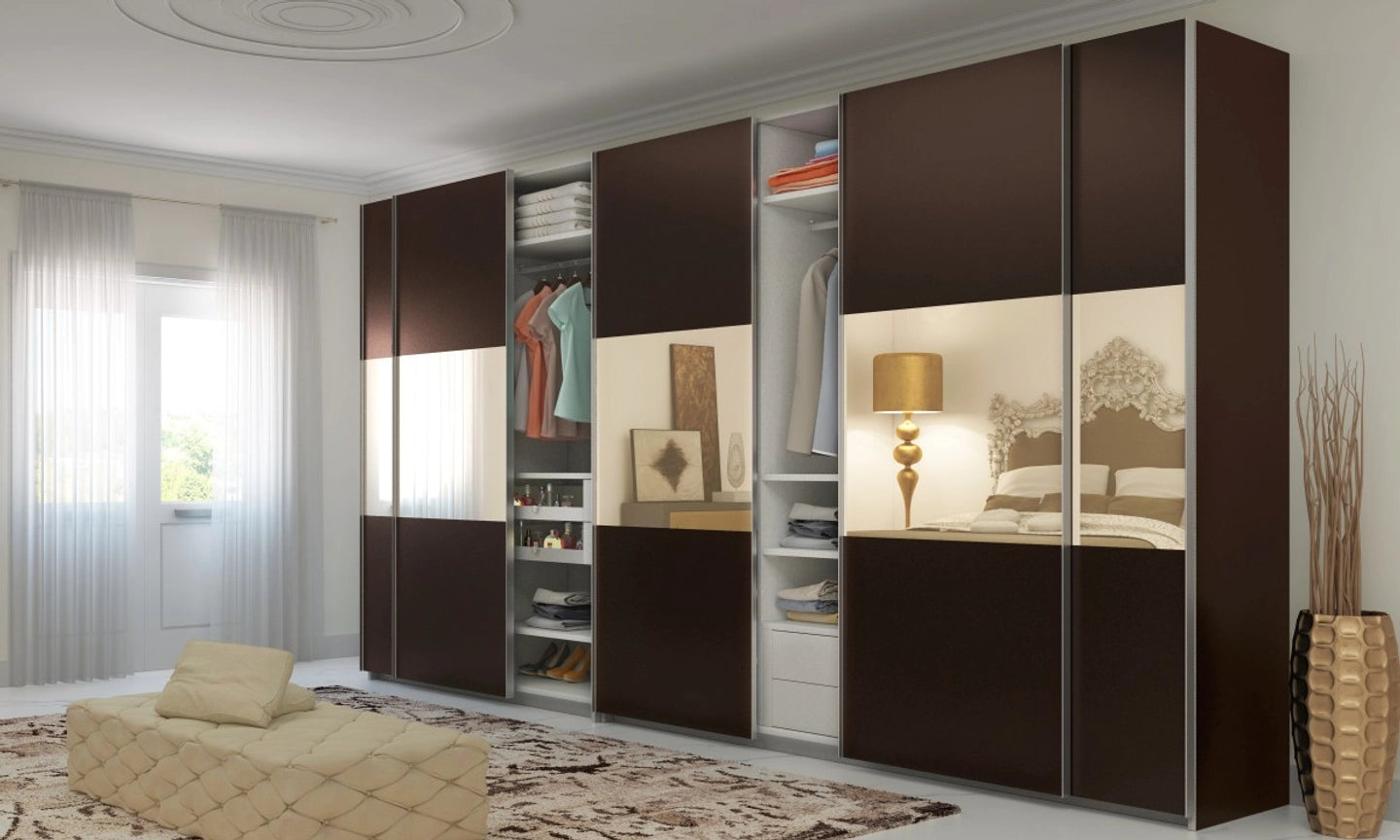 Emanating a glimmer of finesse, lies this wardrobe with sliding doors designed to suit your requirements. Crafted with modern fixtures, this wardrobe is made from an aluminium high gloss finish with a mocha brown print, radiating elegance.