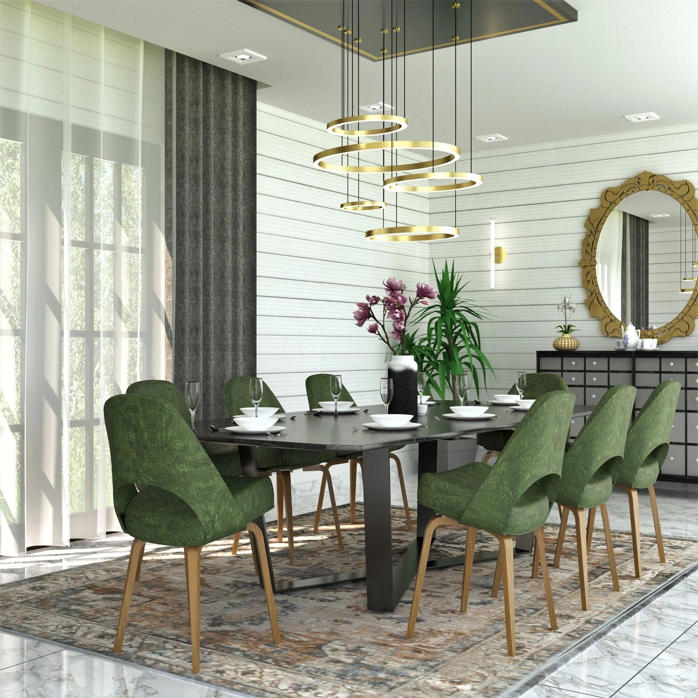 A refreshing and classic theme is acquired in this dining room design. The green chairs are rustic and complement the dark colour of the dining table. This dining room also features a stunning hanging lamp that illuminates the place with a soft cool glow. Natural light enters from the windows....