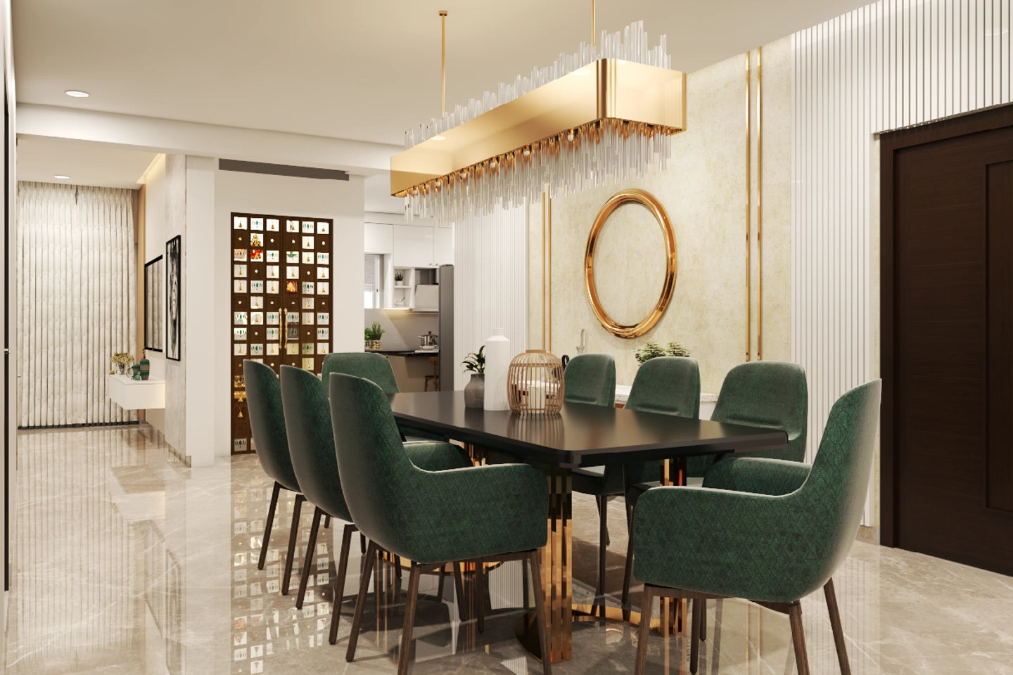 This space has an eight-seater dining table with green-tinted cushion chairs that increase the elegance. Unique lighting over the dining table adds to the beauty. This spacious and comfortable area is ideal for big families..