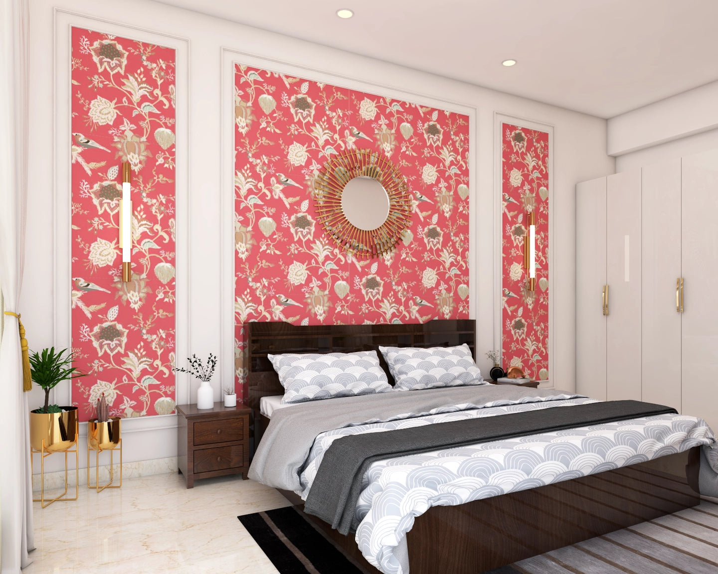 A spacious bedroom with classic royal interiors. The wall trims with floral wallpaper and golden sunburst decor look beautiful. The use of golden potted plants in the room adds up to the classical style of the room. The wooden bed has a built-in space for storage.